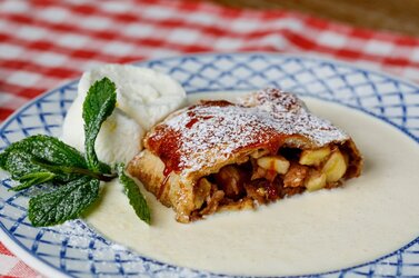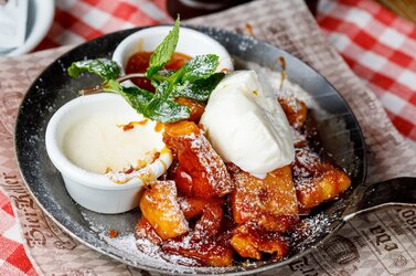 Нежное слоеное тесто с сочной начинкой из печеных яблок и ароматной корицы. Подается с шариком ванильного мороженого и мятным акцентом.