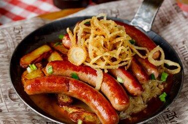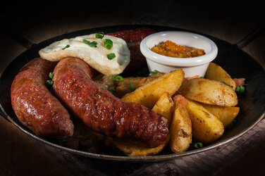 Жареные колбаски из отборной говядины и свинины. Подаются с гарниром из тушеной белой капусты с беконом, жареным картофелем и пивным соусом.