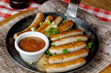 Приготовленные по оригинальному рецепту из отборной свинины и сдобренные специальными приправами колбаски. Подаются с баварской белой каустой, картофельным пюре и сладкой баварской горчицей