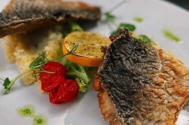 Обжаренное до золотистой корочки филе карпа с гарниром из толченого картофеля, с жареным луком и зеленью.