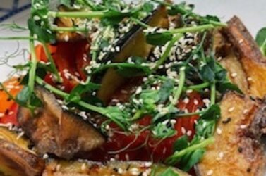 Салат из баклажанов в хрустящей панировке со свежими томатами.